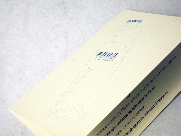 We designed this folded rack card for CTNP Orthodontics. This is a practice questionnaire for patient satisfaction. The illustration on the front shows a big toothpaste tube.